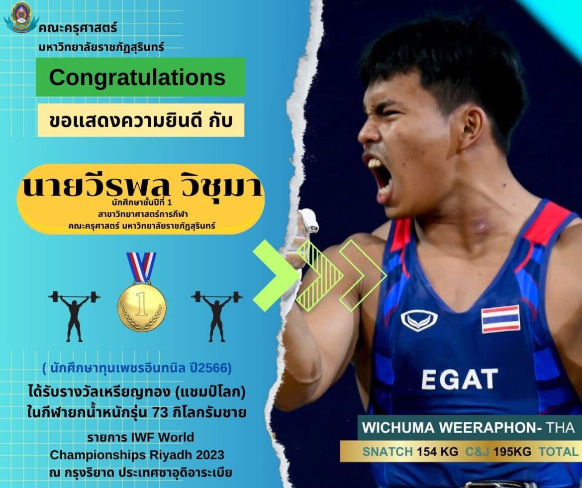 ข่าวสารและความเคลื่อนไหวรางวัลและความภาคภูมิใจสาขาวิชาวิทยาศาสตร์การกีฬา คณะครุศาสตร์ ขอแสดงความยินดี กับ นายวีรพล วิชุมา นักศึกษาชั้นปีที่ 1 สาขาวิทยาศาสตร์การกีฬา ผู้เขียน คณะครุศาสตร์ 11 กันยายน, 2023 ผู้เขียน คณะครุศาสตร์ 11 กันยายน, 2023 2.5K คณะครุศาสตร์ ขอแสดงความยินดี กับ นายวีรพล วิชุมา นักศึกษาชั้นปีที่ 1 สาขาวิทยาศาสตร์การกีฬา คณะครุศาสตร์ มหาวิทยาลัยราชภัฏสุรินทร์ ( นักศึกษาทุนเพชรอินทนิล ปี 2566) ที่ได้รับรางวัลเหรียญทอง (แชมป์โลก) ในกีฬายกน้ำหนักรุ่น 73 กิโลกรัมชาย รายการ IWF World Championships Riyadh 2023 แข่งขัน ณ กรุงริยาด ประเทศซาอุดิอาระเบีย ก่อนหน้า การเตรียมความพร้อมขึ้นทะเบียนรับใบขออนุญาตประกอบวิชาชีพครู ผ่านระบบ (KSP Bundit Online) สำหรับนักศึกษาหลักสูตรครุศาสตรบัณฑิต ชั้นปีที่ 1 ถัดไป การสัมมนานักศึกษาหลักสูตรครุศาสตรบัณฑิต รายวิชาการปฏิบัติงานวิชาชีพระหว่างเรียน 2 (SIL2) ข่าวอัพเดท คณะครุศา... 6 ตุลาคม, 2025 มอบทุนกา... 21 สิงหาคม, 2025 สำนักงาน... 13 สิงหาคม, 2025 ทรงพระเจ... 8 สิงหาคม, 2025 เตรียมเป... 18 กรกฎาคม, 2025 ทรงพระเจ... 13 กรกฎาคม, 2025 การตรวจป... 10 กรกฎาคม, 2025 ประชุมกา... 10 กรกฎาคม, 2025 หลักสูตร... 9 กรกฎาคม, 2025 การประชุ... 9 กรกฎาคม, 2025