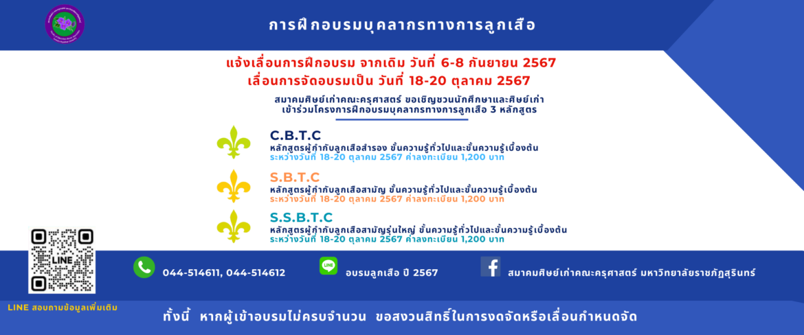 slidealumniข่าวสารและความเคลื่อนไหวสมาคมศิษย์เก่า แจ้งเลื่อนการจัดอบรมโครงการฝึกอบรมบุคลากรทางการลูกเสือ และขอเชิญชวนนักศึกษาและศิษย์เก่าเข้าร่วมโครงการฝึกอบรมบุคลากรทางการลูกเสือ ผู้เขียน คณะครุศาสตร์ 28 สิงหาคม, 2024 ผู้เขียน คณะครุศาสตร์ 28 สิงหาคม, 2024 2.7K แจ้งเลื่อนการจัดอบรมโครงการฝึกอบรมบุคลากรทางการลูกเสือ และขอเชิญชวนนักศึกษาและศิษย์เก่าเข้าร่วมโครงการฝึกอบรมบุคลากรทางการลูกเสือ จากเดิม วันที่ : 6-8 กันยายน 2567 เลื่อนการจัดอบรมเป็น วันที่ : 18-20 ตุลาคม 2567 สมัครเข้ารับการอบรมลูกเสือ ผู้สนใจสมัครเข้ารับการอบรม สามารถสมัครได้ตั้งแต่บัดนี้ ถึง วันที่ 30 กันยายน 2567 หลักสูตรที่จัดอบรม ดังนี้ หลักสูตร C.B.T.C หลักสูตรผู้กำกับลูกเสือสำรอง ขั้นความรู้ทั่วไปและขั้นความรู้เบื้องต้น (วันที่ 18-20 ตุลาคม 2567 ค่าลงทะเบียน 1200 บาท) หลักสูตร S.B.T.C หลักสูตรผู้กำกับลูกเสือสามัญ ขั้นความรู้ทั่วไปและขั้นความรู้เบื้องต้น (วันที่ 18-20 ตุลาคม 2567 ค่าลงทะเบียน 1200 บาท) หลักสูตร S.S.B.T.C หลักสูตรผู้กำกับลูกเสือสามัญรุ่นใหญ่ ขั้นความรู้ทั่วไปและชั้นความรู้เบื้องต้น (วันที่ 18-20 ตุลาคม 2567 ค่าลงทะเบียน 1200 บาท) ชำระเงินค่าลงทะเบียน ธ.กรุงเทพ เลขที่บัญชี 644-0631-63-5 ชื่อบัญชี สมาคมศิษย์เก่าคณะครุศาสตร์ ม.ราชภัฏสุรินทร์ ก่อนหน้า โครงการประชุมเชิงปฏิบัติการเตรียมความพร้อมนักศึกษาครู การฝึกประสบการณ์วิชาชีพ หลักสูตรครุศาสตร์บัณฑิตและหลักสูตรครุศาสตรอุตสาหกรรมบัณฑิต แบบเน้นผลลัพธ์การเรียนรู้ ถัดไป ประชุมเชิงปฏิบัติการผู้บริหารสถานศึกษา เครือข่ายโรงเรียนร่วมผลิต ข่าวอัพเดท แนวปฏิบั... 15 พฤศจิกายน, 2025 แบบประเม... 15 พฤศจิกายน, 2025 บรรยากาศ... 15 พฤศจิกายน, 2025 สนามสอบใ... 15 พฤศจิกายน, 2025 คณะครุศา... 6 ตุลาคม, 2025 มอบทุนกา... 21 สิงหาคม, 2025 สำนักงาน... 13 สิงหาคม, 2025 ทรงพระเจ... 8 สิงหาคม, 2025 เตรียมเป... 18 กรกฎาคม, 2025 ทรงพระเจ... 13 กรกฎาคม, 2025