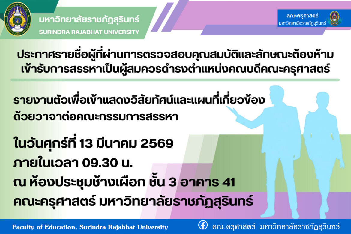 ข่าวสารและความเคลื่อนไหวสรรหาคณบดีคณะครุศาสตร์ 2569 ประกาศรายชื่อผู้ผ่านการตรวจสอบคุณสมบัติและลักษณะต้องห้าม เพื่อเข้ารับการสรรหาเป็นผู้สมควรดำรงตำแหน่งคณบดีคณะครุศาสตร์ ผู้เขียน คณะครุศาสตร์ 5 มีนาคม, 2026 ผู้เขียน คณะครุศาสตร์ 5 มีนาคม, 2026 7 ประกาศรายชื่อผู้ผ่านการตรวจสอบคุณสมบัติและลักษณะต้องห้าม เพื่อเข้ารับการสรรหาเป็นผู้สมควรดำรงตำแหน่งคณบดีคณะครุศาสตร์ รายงานตัวเพื่อเข้าแสดงวิสัยทัศน์และแผนที่เกี่ยวข้องด้วยวาจาต่อคณะกรรมการสรรหา วันศุกร์ที่ 13 มีนาคม พ.ศ. 2569 เวลา 09.30 น. ณ ห้องประชุมช้างเผือก ชั้น 3 อาคาร 41 คณะครุศาสตร์ มหาวิทยาลัยราชภัฏสุรินทร์ คลิ๊กลิงก์ประกาศคณะกรรมการสรรหาคณบดีคณะครุศาสตร์ ฉบับที่ 3/2569 0 ก่อนหน้า คุรุสภาเปิดรับสมัครการเข้ารับการทดสอบด้านความรู้และประสบการณ์วิชาชีพ ตามมาตรฐานวิชาชีพครู วิชาครู ครั้งที่ 1 ระบบอิเล็กทรอนิกส์ ประจำปี พ.ศ. 2569 ข่าวอัพเดท คุรุสภาเ... 27 กุมภาพันธ์, 2026 เตรียมคว... 27 กุมภาพันธ์, 2026 กิจกรรมส... 19 กุมภาพันธ์, 2026 รายงานกา... 18 กุมภาพันธ์, 2026 ขอแสดงคว... 17 กุมภาพันธ์, 2026 ขอแสดงคว... 17 กุมภาพันธ์, 2026 ขอแสดงคว... 17 กุมภาพันธ์, 2026 คณะครุศา... 16 กุมภาพันธ์, 2026 เปิดรับส... 16 กุมภาพันธ์, 2026