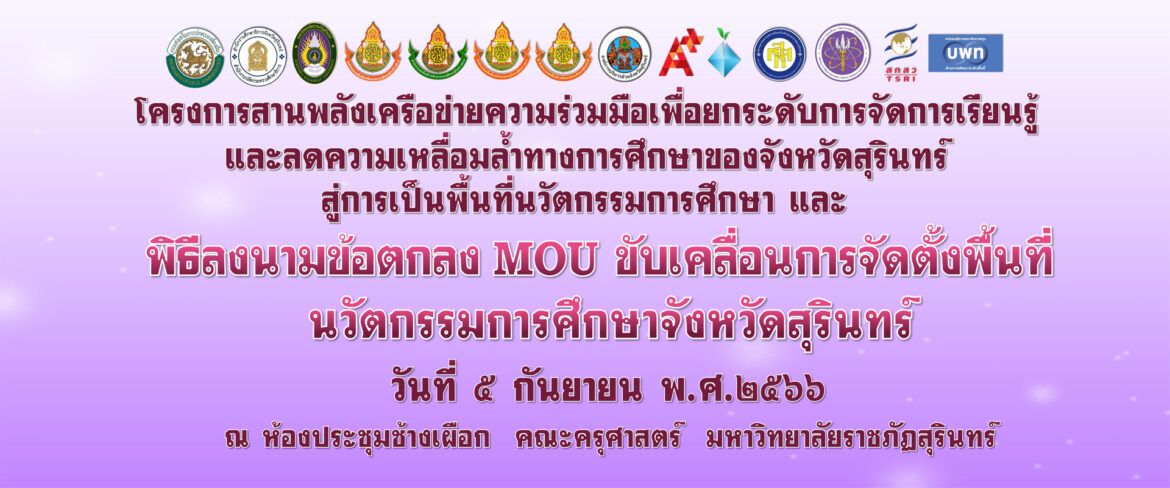 โครงการสานพลักเครือข่ายความร่วมมือเพื่อยกระดับการจัดการเรียนรู้และลดความเหลื่อมล้ำทางการศึกษาของจังหวัดสุรินทร์สู่การเป็นพื้นที่นวัตกรรมการศึกษาและพิธีลงนามข้อตกลง MOU ขับเคลื่อนการจัดตั้งพื้นที่นวัตกรรมการศึกษาจังหวัดสุรินทร์ วันที่ 5 กันยายน พ.ศ.2566 ณห้องประชุมช้างเผือก คณะครุศาสตร์ มหาวิทยาลัยราชภัฏสุรินทร์