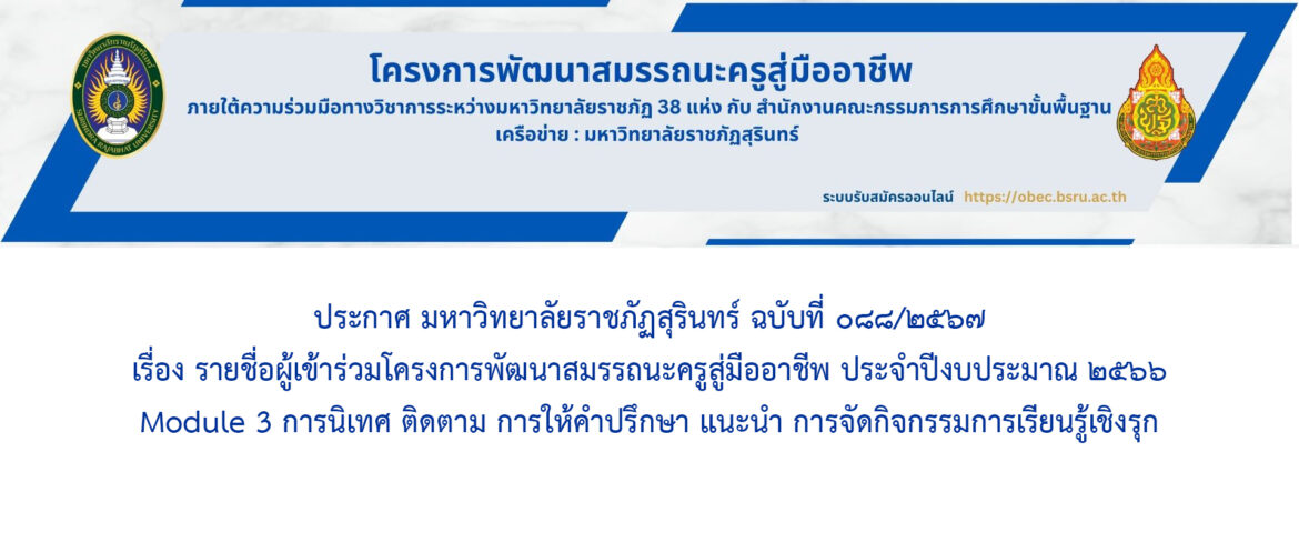 ประกาศ มหาวิทยาลัยราชภัฏสุรินทร์ ฉบับที่ ๐๘๘/๒๕๖๗ เรื่อง รายชื่อผู้เข้าร่วมโครงการพัฒนาสมรรถนะครูสู่มืออาชีพ ประจำปีงบประมาณ ๒๕๖๖ Module 3 การนิเทศ ติดตาม การให้คำปรึกษา แนะนำ การจัดกิจกรรมการเรียนรู้เชิงรุก