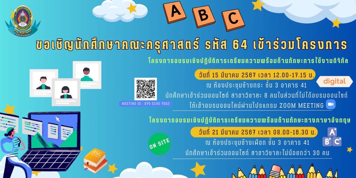 ข่าวการอบรมข่าวสารและความเคลื่อนไหว ประชาสัมพันธ์ แจ้งไปยังนักศึกษาสังกัดคณะครุศาสตร์ รหัส 64 โครงการอบรมเชิงปฏิบัติการเตรียมความพร้อมด้านทักษะการใช้งานดิจิทัลและโครงการอบรมเชิงปฏิบัติการเตรียมความพร้อมด้านทักษะทางภาษาอังกฤษ ผู้เขียน คณะครุศาสตร์ 12 มีนาคม, 2024 ผู้เขียน คณะครุศาสตร์ 12 มีนาคม, 2024 1.2K ประชาสัมพันธ์ แจ้งไปยังนักศึกษาสังกัดคณะครุศาสตร์ รหัส 64 โครงการอบรมเชิงปฏิบัติการเตรียมความพร้อมด้านทักษะการใช้งานดิจิทัล วันที่ 15 มีนาคม 2567 เวลา 12.00-17.15 น. ณ ห้องประชุมช้างกระ ชั้น 3 อาคาร 41 นักศึกษาเข้าร่วมออนไซต์ สาขาวิชาละ 8 คนในส่วนที่ไม่ได้อบรมออนไซต์ ให้เข้าอบรมออนไลน์ผ่านโปรแกรม Zoom meeting Meeting ID : 970 5245 7002 โครงการอบรมเชิงปฏิบัติการเตรียมความพร้อมด้านทักษะทางภาษาอังกฤษ วันที่ 21 มีนาคม 2567 เวลา 08.00-16.30 น. ณ ห้องประชุมช้างเผือก ชั้น 3 อาคาร 41 นักศึกษาเข้าร่วมออนไซต์ สาขาวิชาละไม่น้อยกว่า 30 คน ก่อนหน้า ประกาศรายชื่อผู้มีสิทธิ์สอบคัดเลือก รอบที่ 2 ภาคปกติ ประจำปีการศึกษา 2567 ถัดไป โครงการเสวนาและแลกเปลี่ยนเรียนรู้ เรื่องกระบวนการและขั้นตอนการเตรียมความพร้อมในการขอกำหนดตำแหน่งทางวิชาการของบุคลากรสายวิชาการ ข่าวอัพเดท คณะครุศา... 6 ตุลาคม, 2025 มอบทุนกา... 21 สิงหาคม, 2025 สำนักงาน... 13 สิงหาคม, 2025 ทรงพระเจ... 8 สิงหาคม, 2025 เตรียมเป... 18 กรกฎาคม, 2025 ทรงพระเจ... 13 กรกฎาคม, 2025 การตรวจป... 10 กรกฎาคม, 2025 ประชุมกา... 10 กรกฎาคม, 2025 หลักสูตร... 9 กรกฎาคม, 2025 การประชุ... 9 กรกฎาคม, 2025