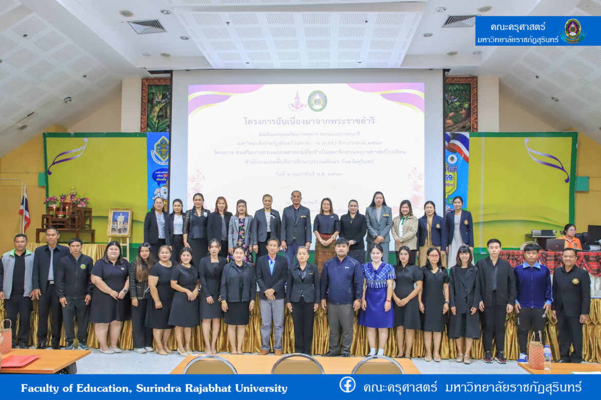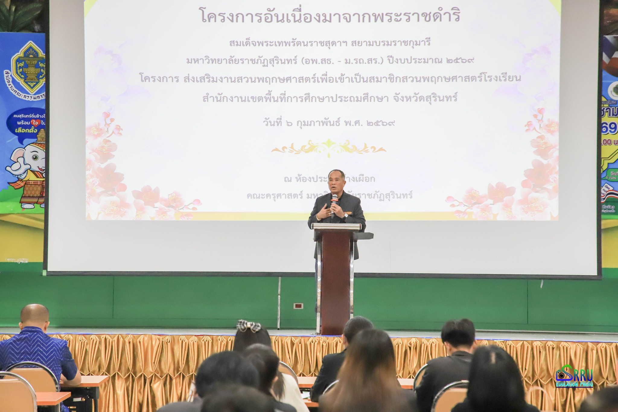 ข่าวการอบรมข่าวสารและความเคลื่อนไหว โครงการอันเนื่องมาจากพระราชดำริ สมเด็จพระเทพรัตนราชสุดาฯ สยามบรมราชกุมารี มหาวิทยาลัยราชภัฏสุรินทร์ (อพ.สธ.-มรภ.สร) ประจำปีงบประมาณ 256 ผู้เขียน คณะครุศาสตร์ 9 กุมภาพันธ์, 2026 ผู้เขียน คณะครุศาสตร์ 9 กุมภาพันธ์, 2026 17 วันที่ 6 กุมภาพันธ์ 2569 เวลา 10.00 น. ผู้ช่วยศาสตราจารย์ ดร.วสันต์ชัย กากแก้ว รองอธิการบดี รักษาราชการแทนคณบดีคณะครุศาสตร์ ให้เกียรติเป็นประธานในพิธีเปิด โครงการอันเนื่องมาจากพระราชดำริ สมเด็จพระเทพรัตนราชสุดาฯ สยามบรมราชกุมารี มหาวิทยาลัยราชภัฏสุรินทร์ (อพ.สธ.-มรภ.สร) ประจำปีงบประมาณ 2569 โดยเป็น โครงการส่งเสริมสวนพฤกศาสตร์เพื่อเข้าเป็นสมาชิกสวนพฤกศาสตร์โรงเรียน ร่วมกับสำนักงานเขตพื้นที่การศึกษาประถมศึกษา จังหวัดสุรินทร์ ในโอกาสนี้ อาจารย์ ดร.ปิยนันท์ พูลโสภา ประธานสาขาวิชาการศึกษาปฐมวัย ได้กล่าวรายงานวัตถุประสงค์ของโครงการต่อประธานในพิธี ทั้งนี้ กิจกรรมจัดขึ้น ณ ห้องประชุมช้างเผือก ชั้น 3 อาคาร 41 มหาวิทยาลัยราชภัฏสุรินทร์ โดยมีบุคลากรทางการศึกษาสำนักงานเขตพื้นที่การศึกษาประถมศึกษาเขต 1,2,3 ร่วมกิจกรรมในครั้งนี้ 0 ก่อนหน้า มหาวิทยาลัยราชภัฏสุรินทร์เปิดรับสมัครนักศึกษา ภาคปกติ ปีการศึกษา 2569 รอบที่ 4 ข่าวอัพเดท คุรุสภาป... 30 มกราคม, 2026 ประชุมคณ... 30 มกราคม, 2026 ประชุมเต... 28 มกราคม, 2026 ประชุมเต... 28 มกราคม, 2026 ประกาศ ม... 26 มกราคม, 2026 พิธีมอบเ... 23 มกราคม, 2026 วันครู ค... 17 มกราคม, 2026 การวิจัย... 17 มกราคม, 2026 ขอแสดงคว... 17 มกราคม, 2026 วันครู ค... 17 มกราคม, 2026
