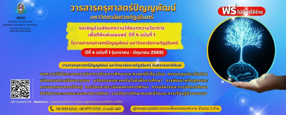 .. ขอเชิญร่วมส่งบทความวิจัยบทความวิชาการเพื่อตีพิมพ์เผยแพร่ ปีที่ 4 ฉบับที่ 1 ในวารสารครุศาสตร์ปัญญพัฒน์ มหาวิทยาลัยราชภัฏสุรินทร์ ผู้เขียน คณะครุศาสตร์ 21 ธันวาคม, 2025 ผู้เขียน คณะครุศาสตร์ 21 ธันวาคม, 2025 96 0 ก่อนหน้า มหาวิทยาลัยราชภัฏสุรินทร์เปิดรับสมัครนักศึกษาระดับปริญญาตรี ภาคปกติ รอบที่ 3 ปีการศึกษา 2569 ถัดไป ทรงพระเจริญ ๘ มกราคม ๒๕๖๙ เนื่องในวันคล้ายวันประสูติ สมเด็จพระเจ้าลูกเธอ เจ้าฟ้าสิริวัณณวรี นารีรัตนราชกัญญา ข่าวอัพเดท วันครู ค... 17 มกราคม, 2026 ทรงพระเจ... 8 มกราคม, 2026 มหาวิทยา... 18 ธันวาคม, 2025 คณะครุศา... 26 ตุลาคม, 2025