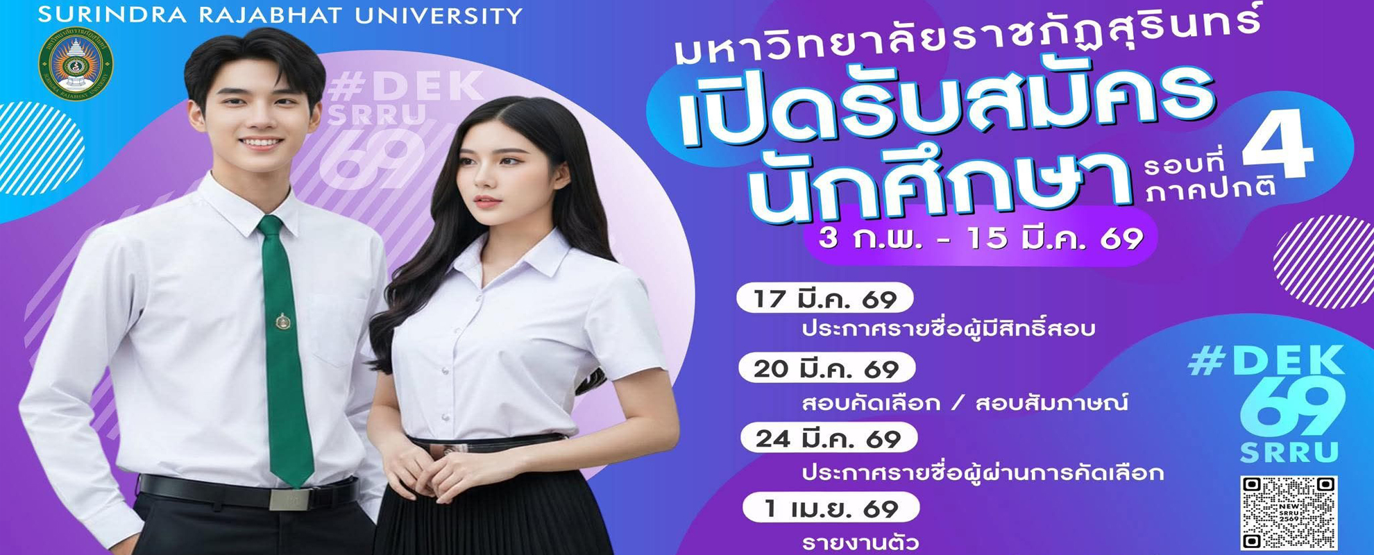 ..การสมัครเข้าศึกษา มหาวิทยาลัยราชภัฏสุรินทร์เปิดรับสมัครนักศึกษา ภาคปกติ ปีการศึกษา 2569 รอบที่ 4 ผู้เขียน คณะครุศาสตร์ 5 กุมภาพันธ์, 2026 ผู้เขียน คณะครุศาสตร์ 5 กุมภาพันธ์, 2026 7 มหาวิทยาลัยราชภัฏสุรินทร์เปิดรับสมัครนักศึกษา ภาคปกติ ปีการศึกษา 2569 รอบที่ 4 อ่านประกาศรับสมัครและเช็กคุณสมบัติให้ละเอียด ลิงก์ประกาศ https://bit.ly/4r4VZuk สมัครออนไลน์ได้ที่ https://new.srru.ac.th ค่าสมัคร 300 บาท โปรโมชั่นพิเศษฟรีค่าสมัคร เฉพาะผู้ที่เคยชำระเงินค่าสมัครแล้ว รายละเอียดเพิ่มเติมในประกาศ – เรียนดี มีคุณภาพ จ่ายสบาย ไม่ต้องจ่ายแพง! – เราเชื่อว่าการศึกษาที่มีคุณภาพต้องเข้าถึงได้ ค่าเทอมเพียง 7,XXX – 8,XXX บาท แบ่งจ่ายได้ 2 งวด – โอกาสสำหรับบุตรหลานของคุณได้รับสิ่งที่ดีที่สุด ในราคาที่คุณยิ้มได้ รับสมัครระหว่างวันที่ : 3 กุมภาพันธ์ – 15 มีนาคม 2569 – ประกาศรายชื่อผู้มีสิทธิ์สอบคัดเลือกวันที่ 17 มีนาคม 2569 – สอบคัดเลือกวันที่ 20 มีนาคม 2569 – ประกาศรายชื่อผู้ผ่านการคัดเลือกวันที่ 24 มีนาคม 2569 – รายงานตัววันที่ 1 เมษายน 2569 สอบถามข้อมูลเพิ่มเติม โทร. 0-4451-4606 งานรับสมัครนักศึกษา สำนักส่งเสริมวิชาการและงานทะเบียน ชั้น 1 อาคาร 28 0 ก่อนหน้า คุรุสภาประกาศรายชื่อผู้ผ่านเกณฑ์การทดสอบและประเมินสมรรถนะทางวิชาชีพครู ด้านการปฏิบัติงานและการปฏิบัติตน ตามมาตรฐานวิชาชีพครู ครั้งที่ 11/2568 ข่าวอัพเดท วันครู ค... 17 มกราคม, 2026 ทรงพระเจ... 8 มกราคม, 2026 ขอเชิญร่... 21 ธันวาคม, 2025 มหาวิทยา... 18 ธันวาคม, 2025 คณะครุศา... 26 ตุลาคม, 2025 เปิดรับส... 13 สิงหาคม, 2025 ปฐมนิเทศ... 5 มิถุนายน, 2025 คณะครุศา... 4 มิถุนายน, 2025 มหาวิทยา... 21 พฤษภาคม, 2025 ประกาศรา... 30 เมษายน, 2025